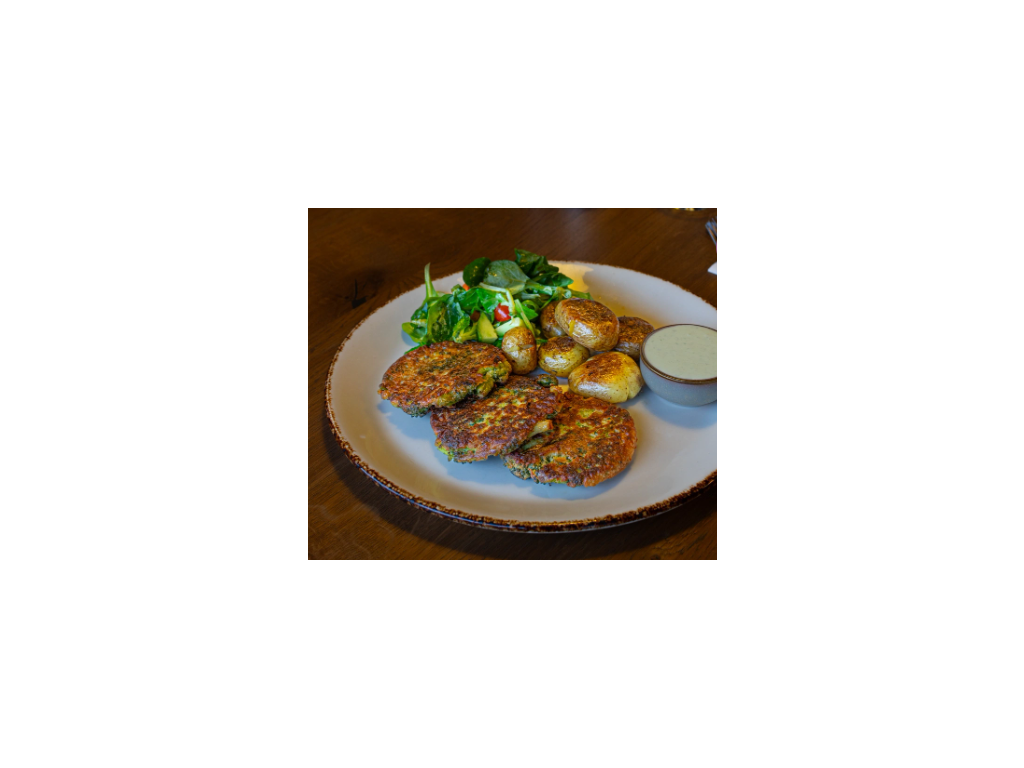 BROKOLICOVÉ PLACIČKY s pečenými brambůrkami Grenaille, polníčkovým salátkem a bylinkovým dipem