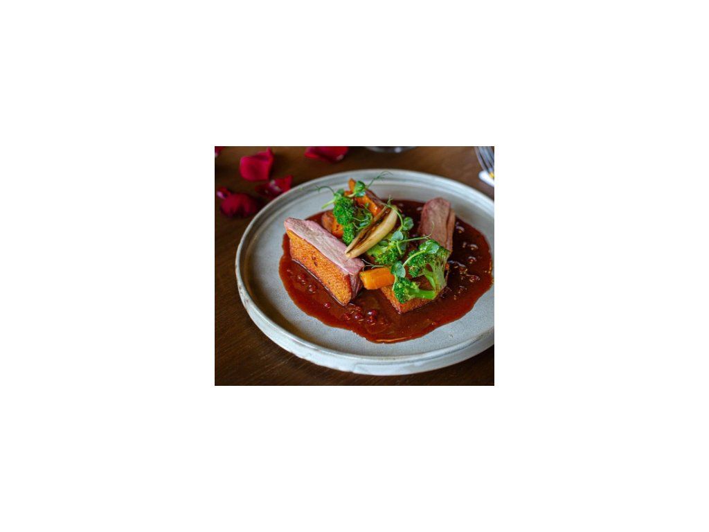 GRILOVANÉ KACHNÍ PRSO s bramborovým restem, pečenou zeleninou a omáčkou z portského vína a brusinek