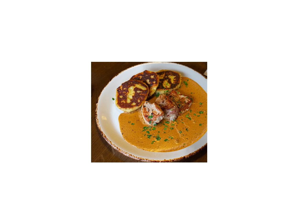 MEDAILONKY Z VEPŘOVÉ PANENKY s pepřovou omáčkou a bramborovo-škvarkové placky