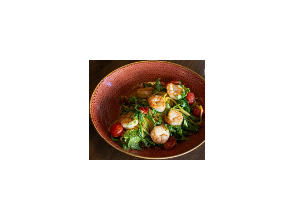 SPAGHETTI S KREVETAMI česnekem, bílým vínem, rukolou, cherry rajčaty, extra virgin olivovým olejem a petrželovou natí